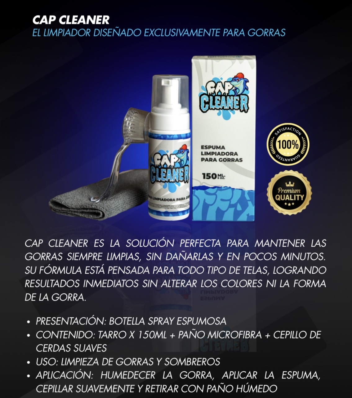 Mantén tus gorras como nuevas con Cap Cleaner, el limpiador diseñado especialmente para cuidar las fibras delicadas de las gorras y sombreros. Su fórmula en espuma elimina manchas de sudor, polvo y suciedad sin dañar los materiales ni deformar la estructura. Ideal para coleccionistas, amantes de las gorras y quienes buscan prolongar la vida útil de sus accesorios favoritos.
